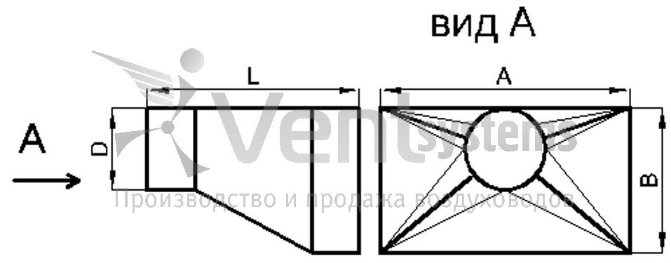 Прямоугольный стальной оцинкованный переход с фланцами (длина перехода подбирается автоматически, исходя из рекомендованных параметров)